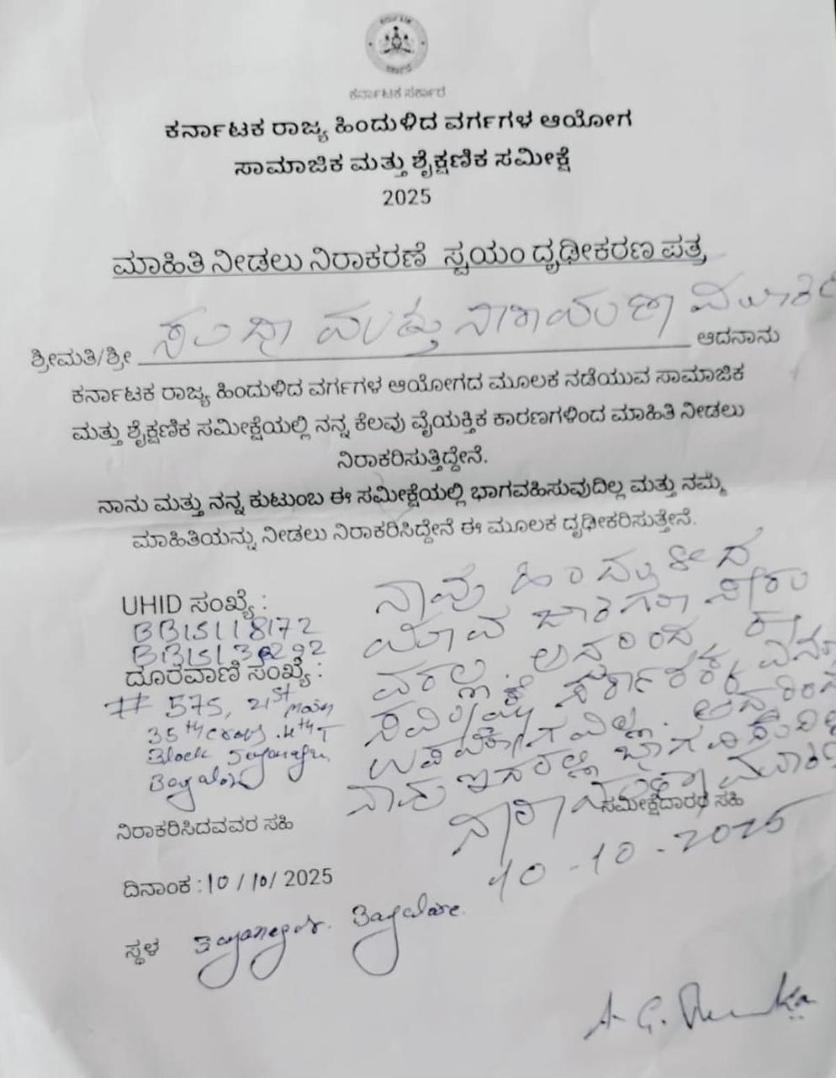 The declaration form stated, ‘Due to some of my personal reasons, I am refusing to provide information in the Social and Educational Survey being conducted by the Karnataka State Backward Classes Commission.’